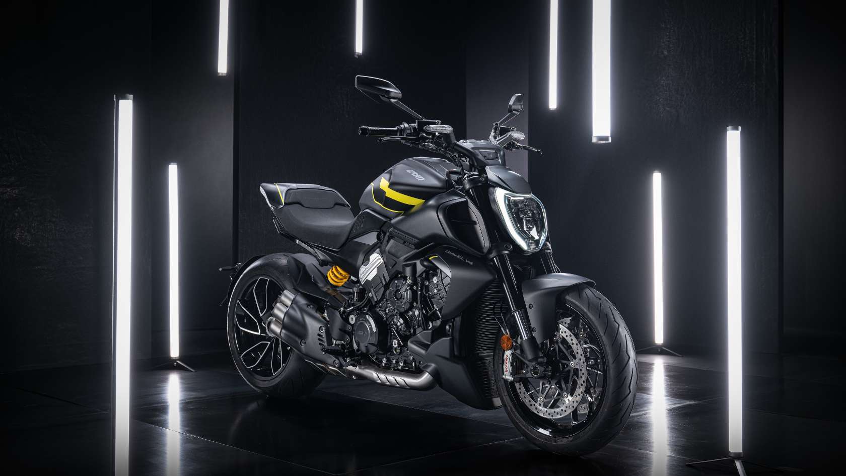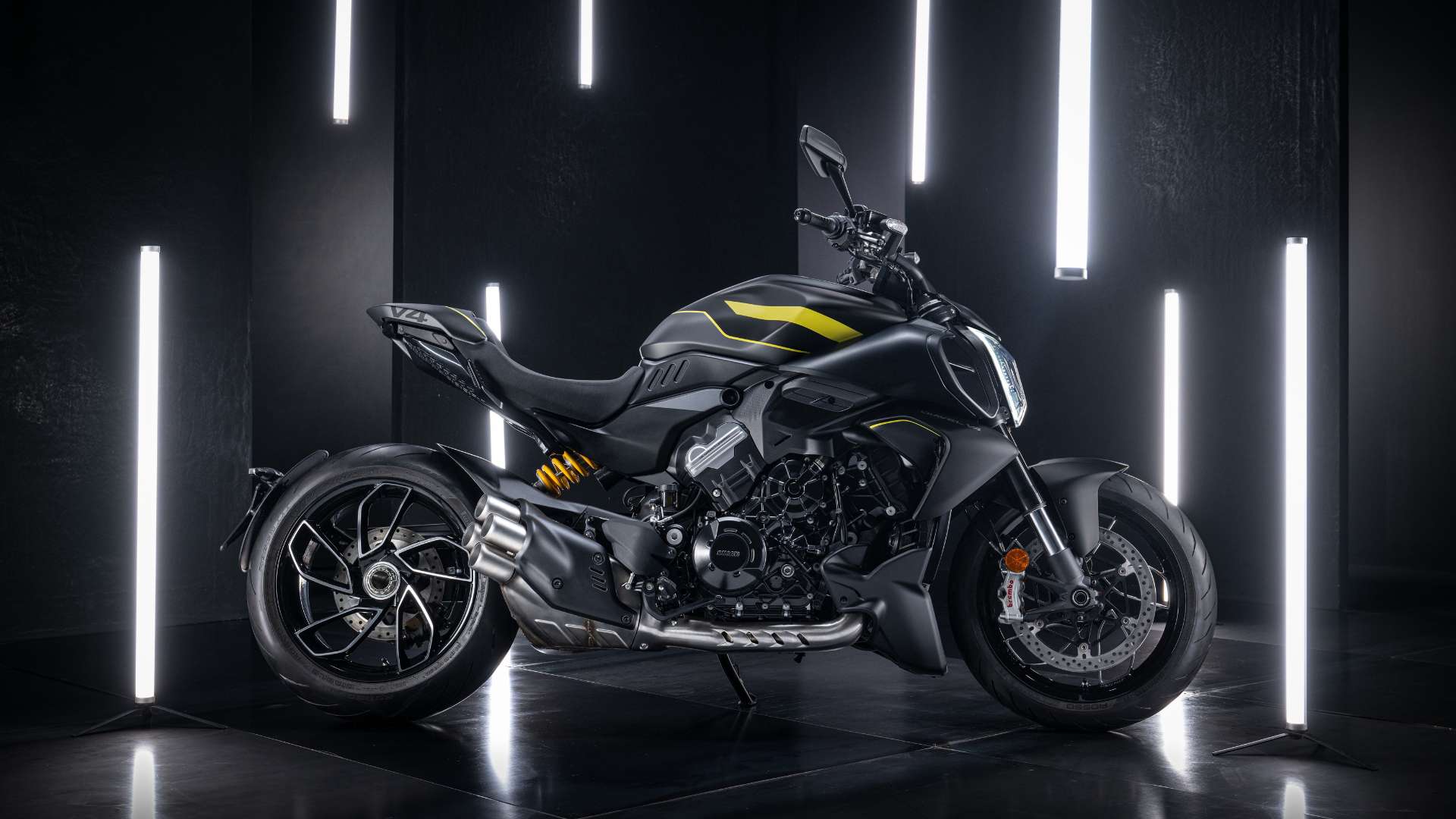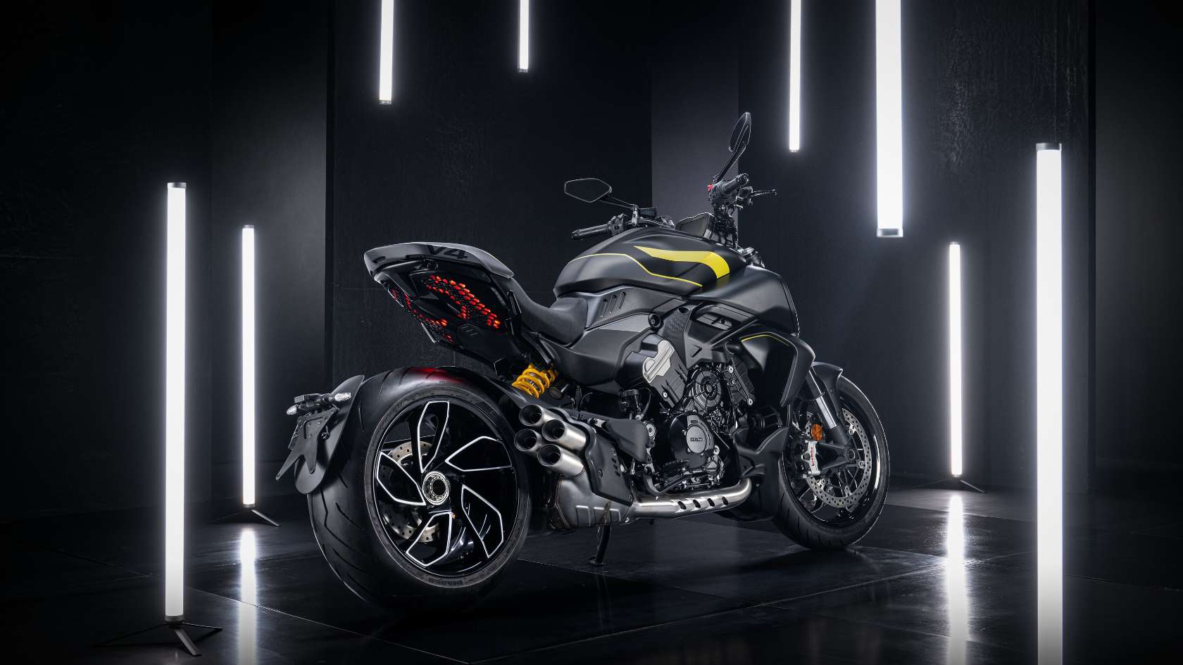 Die Ducati Diavel V4 zieht alle Blicke auf sich: kraftvoll, sportlich, extrovertiert und dennoch elegant. Sie vereint scheinbar gegensätzliche Eigenschaften – die Dynamik eines sportlichen Naked Bikes mit der Präsenz und Haltung eines Muscle-Cruisers.