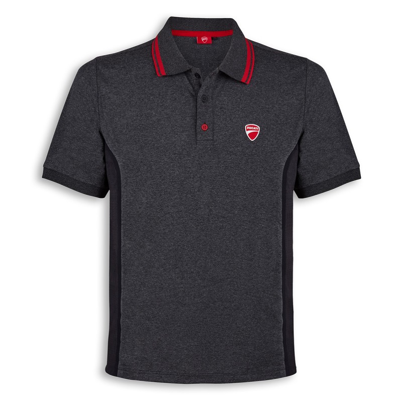 Das Polo aus gemischter Baumwolle ist ein leichtes und weiches Kleidungsstück, das sich ideal für den Alltag eignet. Das Ducati Rot hebt sich vom anthrazitgrauem Hintergrund ab, der das Kleidungsstück ausmacht. An den Seiten schafft ein schwarzer perforierter Einsatz in doppelter Hinsicht (Material und Farbe) einen Kontrast. Komplettiert wird das auch für Damen erhältliche Kleidungsstück durch den roten/grauen Kragen und den gerippten Ärmel. Material: 50% Baumwolle, 50% Polyester.