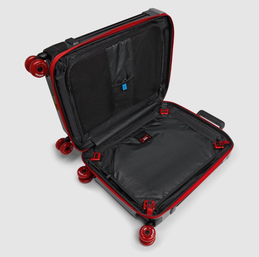 Das Aufeinandertreffen von Innovationsgeist und Suche nach Spitzenleistung der Unternehmen Ducati und Piquadro bringt ein Accessoire hervor, das auf Funktionalität und innovativen Stil setzt. Der sowohl in Rot als auch in Schwarz erhältliche Rollkoffer Piquadro aus Polycarbonat wurde konzipiert, um das Maximum in puncto Leichtigkeit, Stil und Strapazierfähigkeit zu bieten. Das Verschlusssystem mit Kompressionsriemen und der ausziehbare Griff verbessern den Komfort, während das personalisierte Innenfutter und das ausgeklügelte Außendesign die Exklusivität dieses Accessoires betonen, das so zu einer echten Ikone der Exzellenz „Made in Italy“ wird.